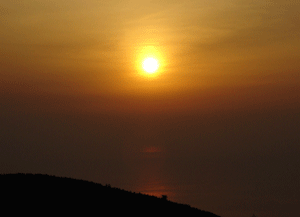 両日とも2時間くらい歩きましたが、全員トレッキングポールを2本使ったノルディックウォーキングスタイルだったため、そんなに疲れを感じませんでした。普段は通勤くらいしか歩くことはありませんが、すばらしい景色とポール2本のおかげで心地よい全身運動にもなり、とても楽しいウォーキングでした。 森林浴から帰ってきたら、食事をして休憩です。私は同室の人とお話をしたり、お昼寝、散歩、お子さん達と遊んだりしてゆったりとした時間を過ごしました。 その後はまた、朝と同じようにヨーガ、瞑想、食事、そして入浴です。お風呂は毎日温泉に連れて行ってもらいました。私は温泉が大好きなのですが、日替わりで、いろんな湯にいくことができました。露天風呂にゆったりと浸かり、とても気持ちよかったです。 今回参加した4日間の断食合宿で一番感動したのは、太陽礼拝です。実は、3日目の朝にも皆で4時に起きて行ったのですが、少し曇っていたため、はっきりと日の出を見ることはできませんでした。早朝の緑に囲まれて空気も澄み、海も見渡せる高原でヨーガ、瞑想、ポールウォーキングをするのは気持ちよく、景色もすばらしかったのですが、どうしても赤い日の出が見たかったので、次の日にも連れて行ってもらいました。その日は7日で、合宿に残ったのは私とスタッフの佐々木さんだけでした、そして、ついに2回目の最終日に見ることができました。水平線から突然真っ赤な太陽が昇り、すばらしい景色で言葉にならないくらい感動しました。この光景は一生忘れないと思います。